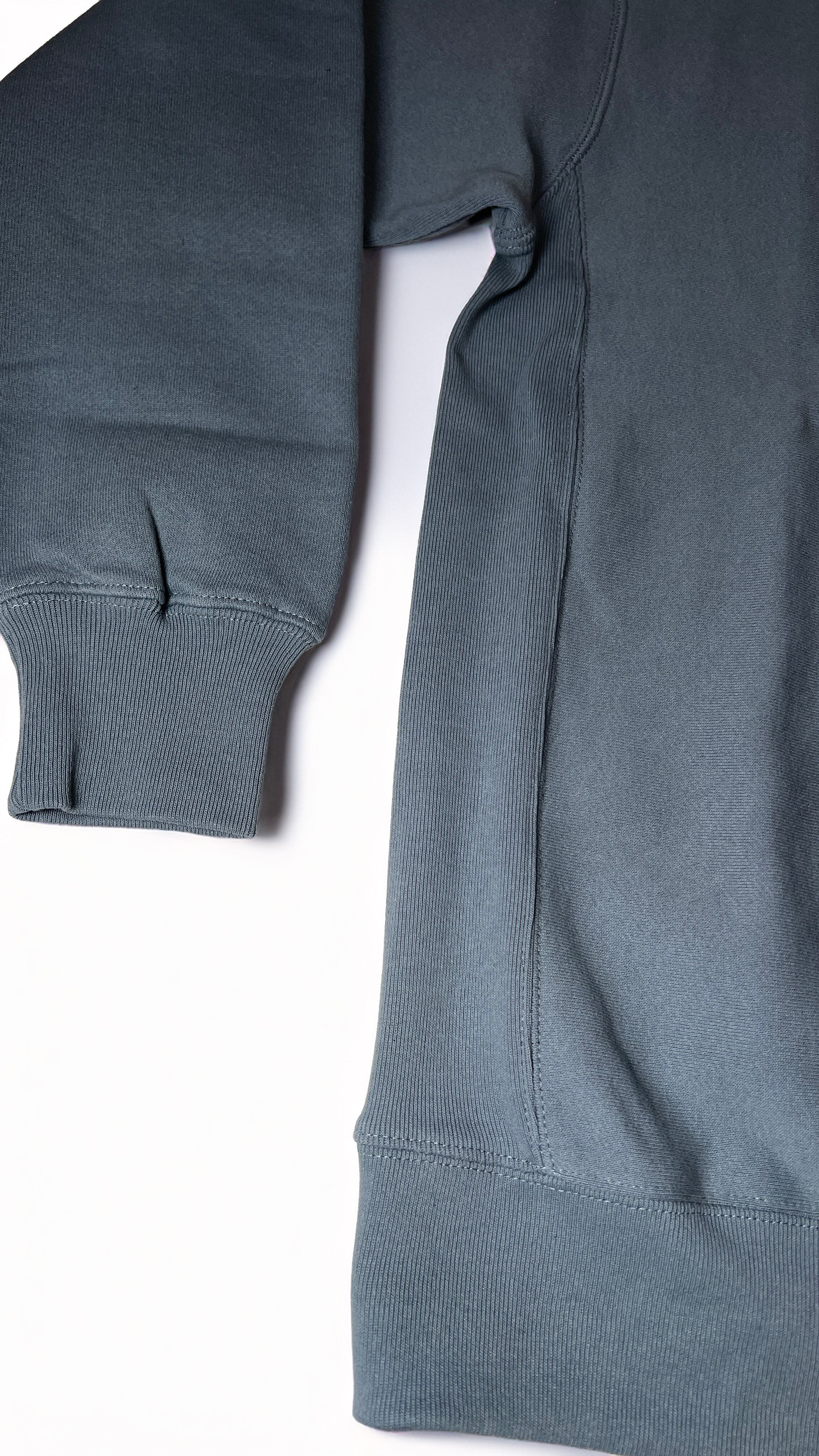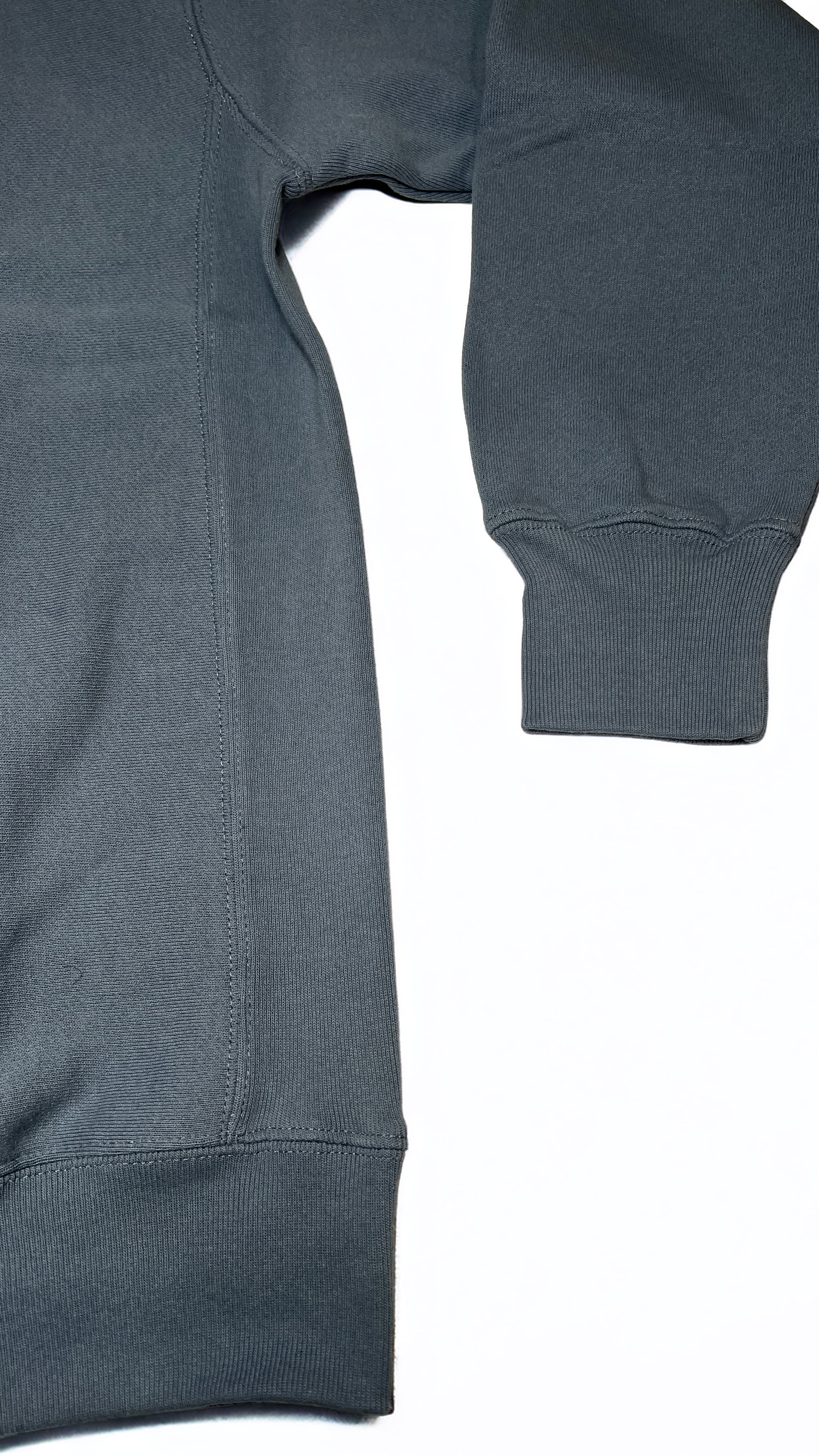 12オンスの極厚生地のボディは表糸は綿100%オープンエンド糸の乾いた肌触りが特徴(※Greyのみ表糸綿80%)。裏起毛なので保温性も高いアイテム。また身頃の生地を横方向に使い縦方向の縮みを抑制、両脇にサイドパネル、リブ(エクスパンションガゼット)を付け横方向への縮み抑制と伸縮性を向上させた所謂リバースウィーブ製法になっている。首、身頃、袖口のリブやシームラインはダブルステッチ。アームホールは2本針始末。