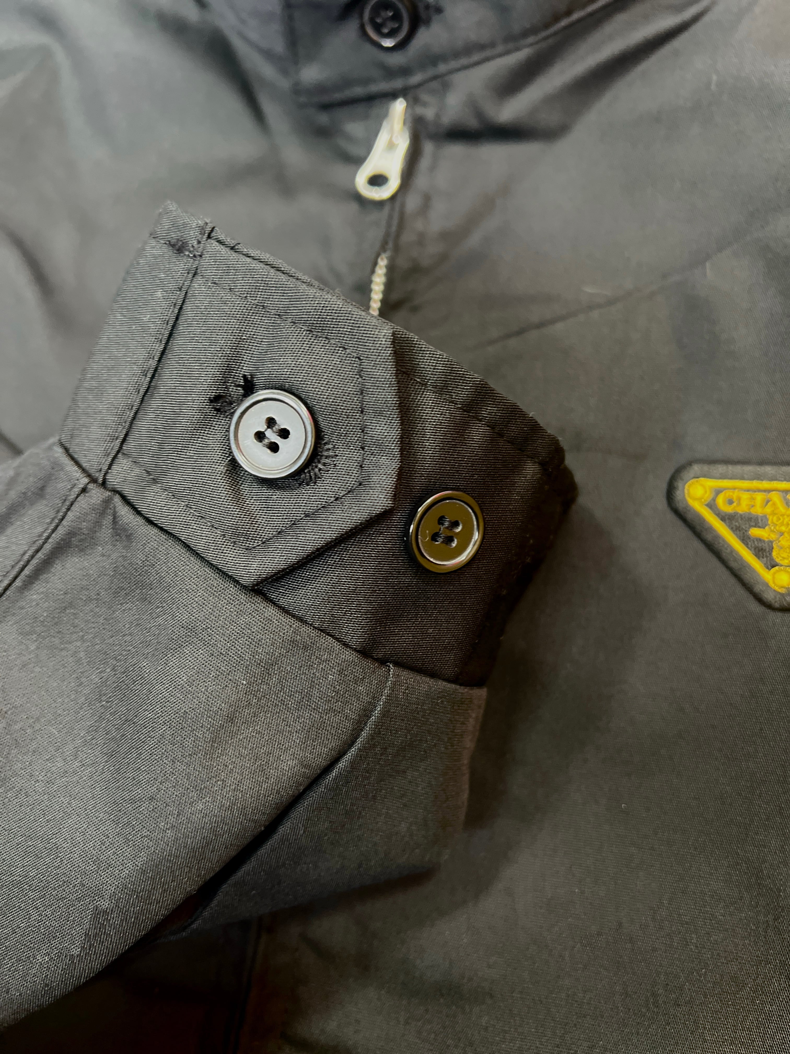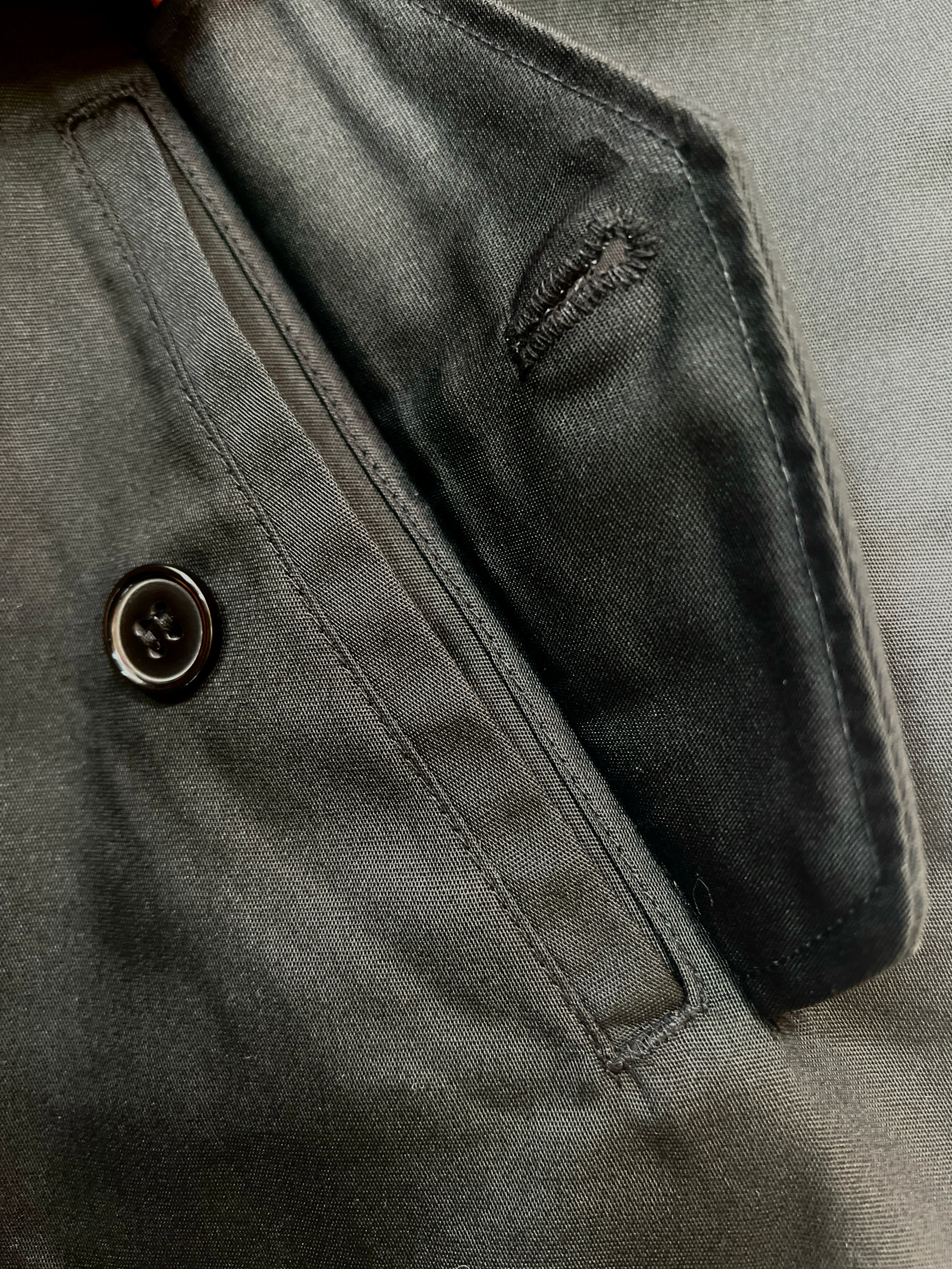 首元はスタンドタイプのドッグイヤーカラー、フロントはシングルスライダージップ(YKK)、腰には便利なフラップ&ボタン付きのポケット。袖口はカフスボタン2個付きで調整可能。表地と同色の裏地付き。